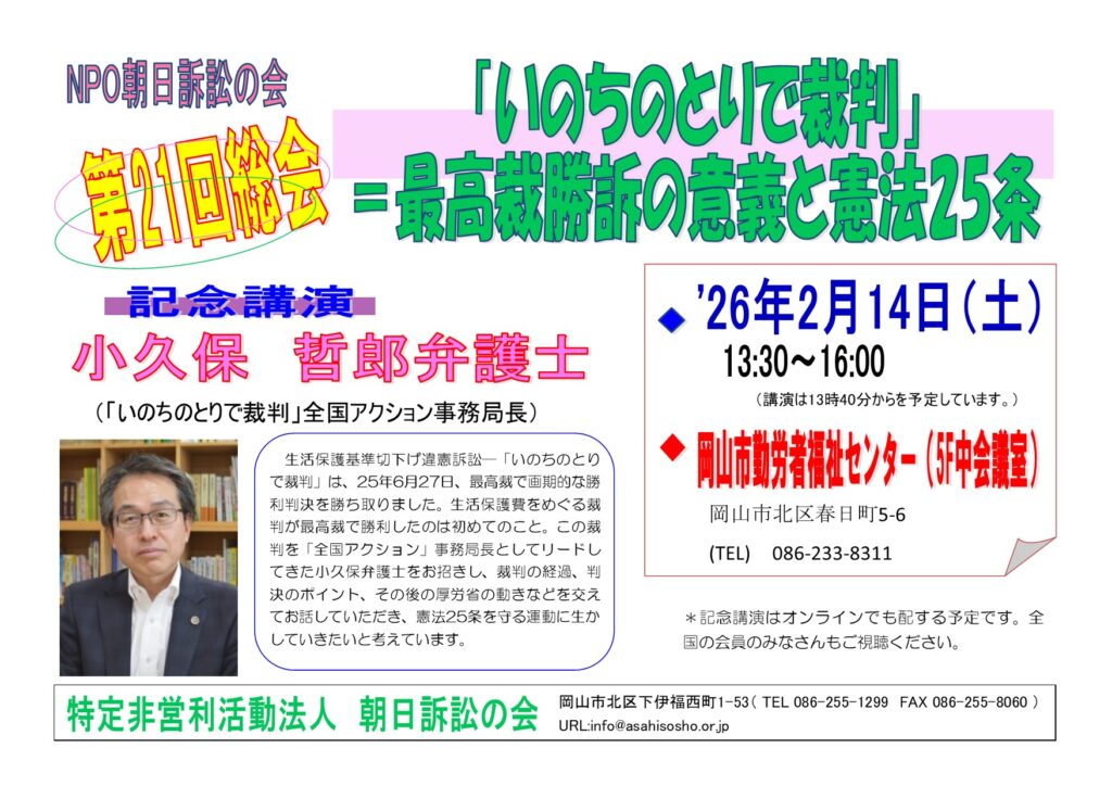 来年の第21回総会の案内チラシが出来上がりました。すでにお知らせのとおり、記念講演の講師に、「いのちのとりで裁判」全国アクション事務局長の小久保哲郎弁護士をお招きします。現在厚労省内で進められている「専門委員会」での不当な議論なども紹介していただく予定です。ご期待ください。
