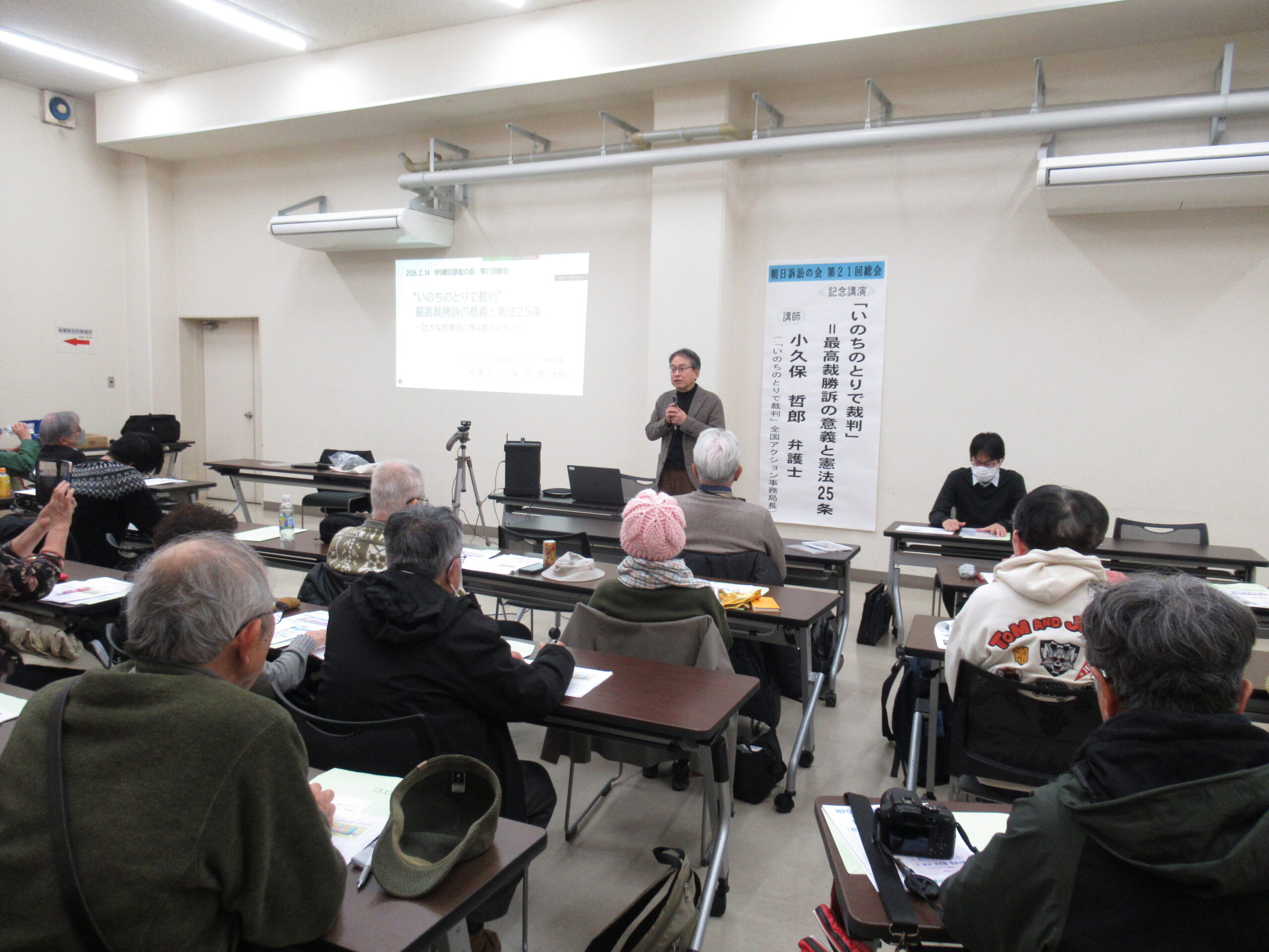 2月14日、第21回総会を開催しました。会員や賛助会員の皆さんをはじめあわせて約60人(ズーム参加含む)の方々に参加していただきました。記念講演は「いのちのとりで裁判」全国アクション事務局長の小久保哲郎弁護士。昨年の最高裁勝利判決の詳しい内容や今、国が司法を軽視し、判決の意義を矮小化する動きに出てきている具体的なお話などをしていただきました。今後、「いのちのとりで裁判」は、再提訴を視野に3回目の「1万件審査請求運動」に取り組むことなどを紹介され、これからの運動への協力を呼びかけられました。