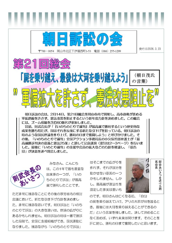 第21回総会まで3週間となりました。降って湧いたような総選挙がはじまり、あわただしくなりましたが、右へ右へと動きが強まるなかで、朝日茂さんが望んだ「憲法が生きる社会をめざして」がんばらなければなりません。